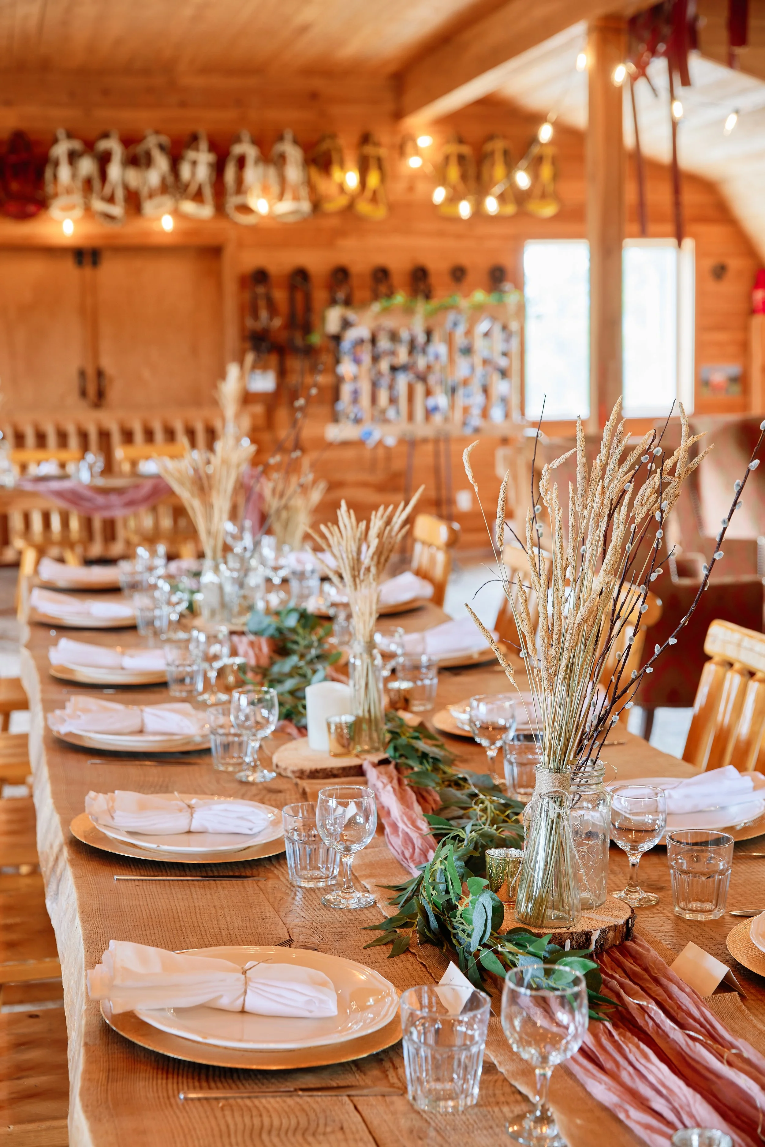 Like what you see? Create your decor shopping list: dusty pink table runners, dried wheat grass, eucalyptus garland & wooden chargers.
