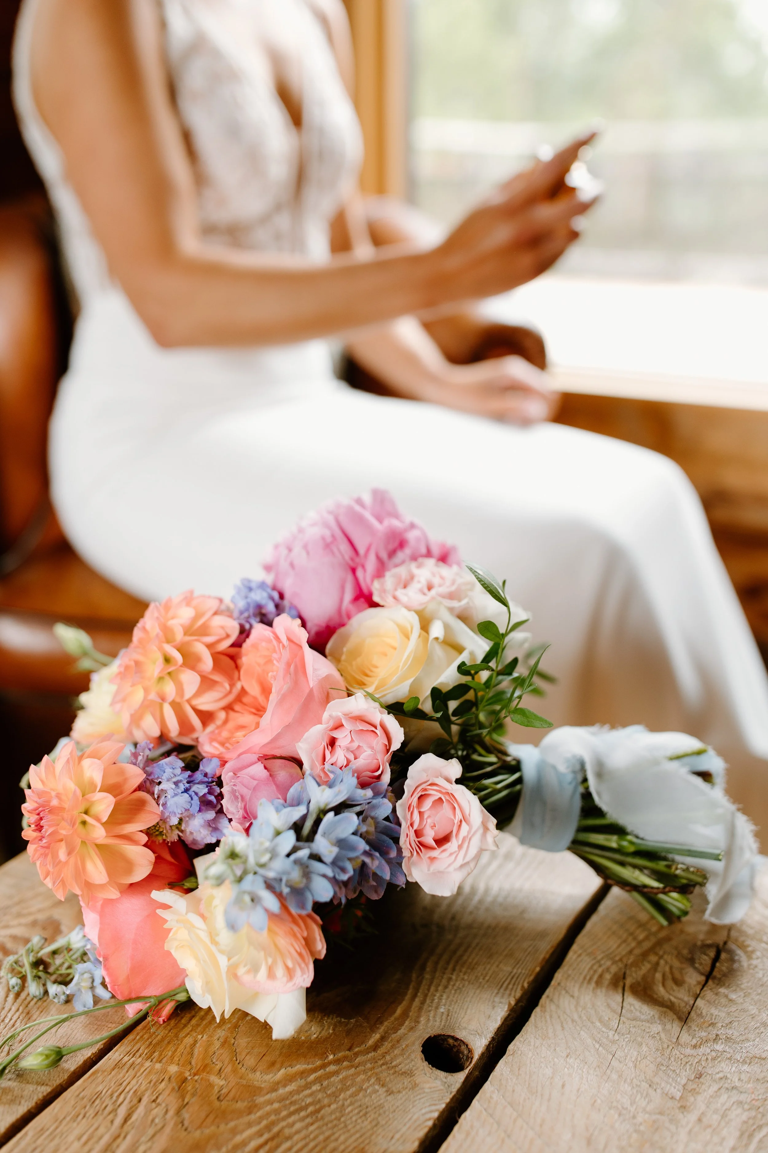 Caught your eye? Ask your florist for bright, garden-style bouquets with peonies, roses, ranunculus, and touches of blue delphinium. A naturally gathered look that pairs beautifully within a multitude of settings.
